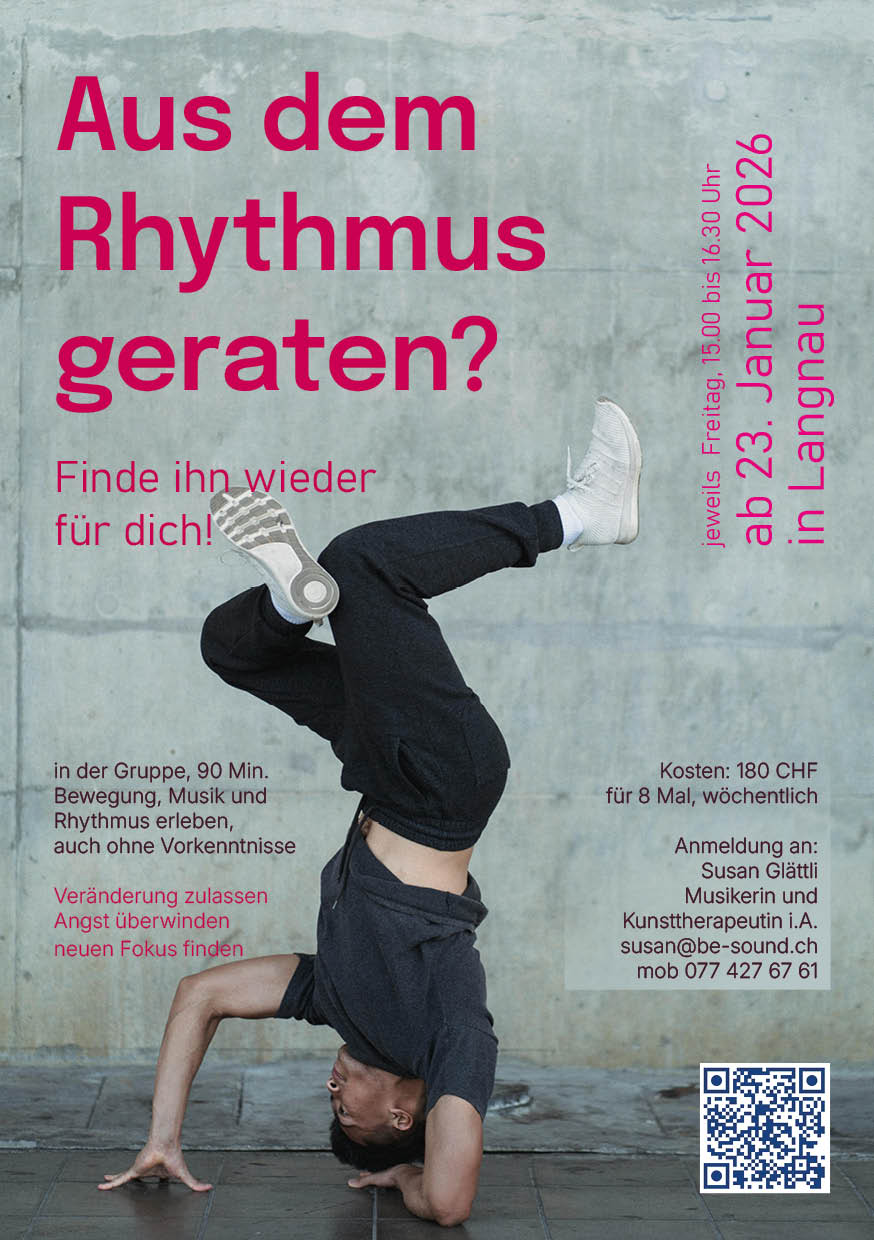 Infos und Anmeldung: Susan Glättli, Kunsttherapeutin in Ausbildung, Tel. 077 427 67 61, susan@be-sound.ch